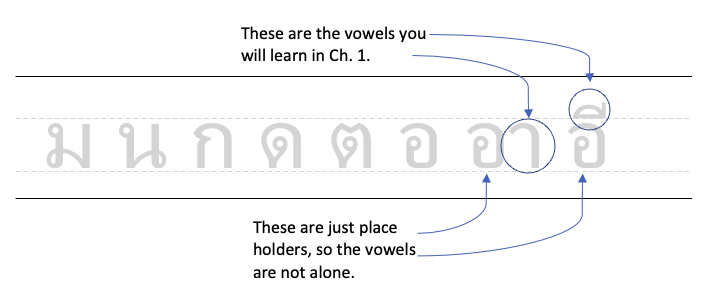 - Thai vowels are never written alone–so you will see them written with placeholders. When words are written, the placeholders are dropped and consonants are put in their place.