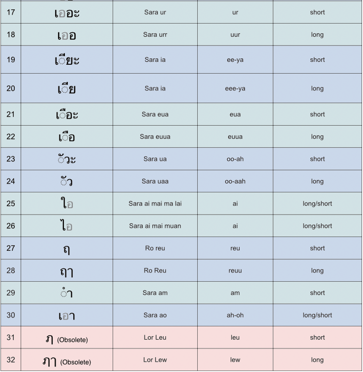 - The letters in rows 31 and 32 are no longer used in the Thai alphabet.