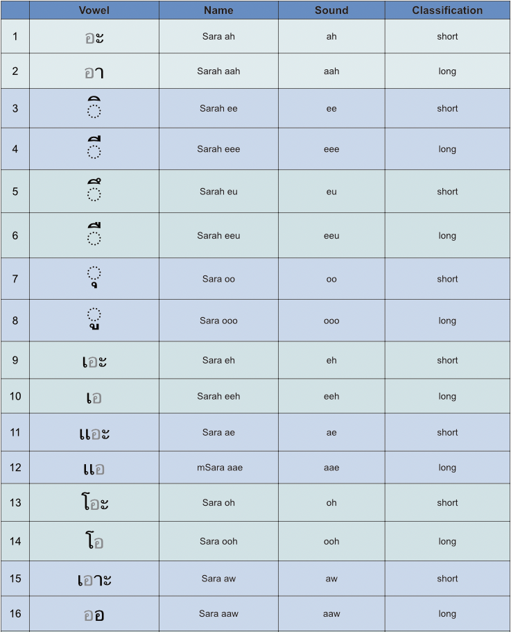 - Each of the 32 Thai vowels are either long or short, which is very simple.