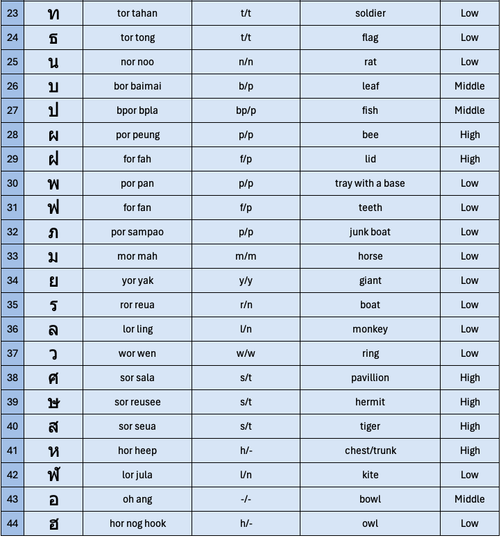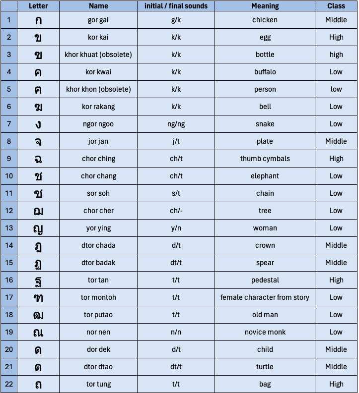 - All Thai consonants fit into one of three categories, low, middle, or high class. These dictate pronunciation rules, which you will learn later.