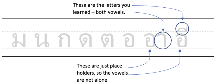 Finally, as you learned earlier, Thai vowels are never left alone. If you want to write just the vowel, pair it with the consonant อ, like you see below.